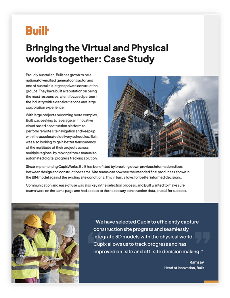 By using CupixWorks, Built eliminated the information silos between design and construction teams. Site teams can now use the BIM model to see the intended final product against the existing site conditions, thus allowing for better informed decisions. Download the case study to see how.