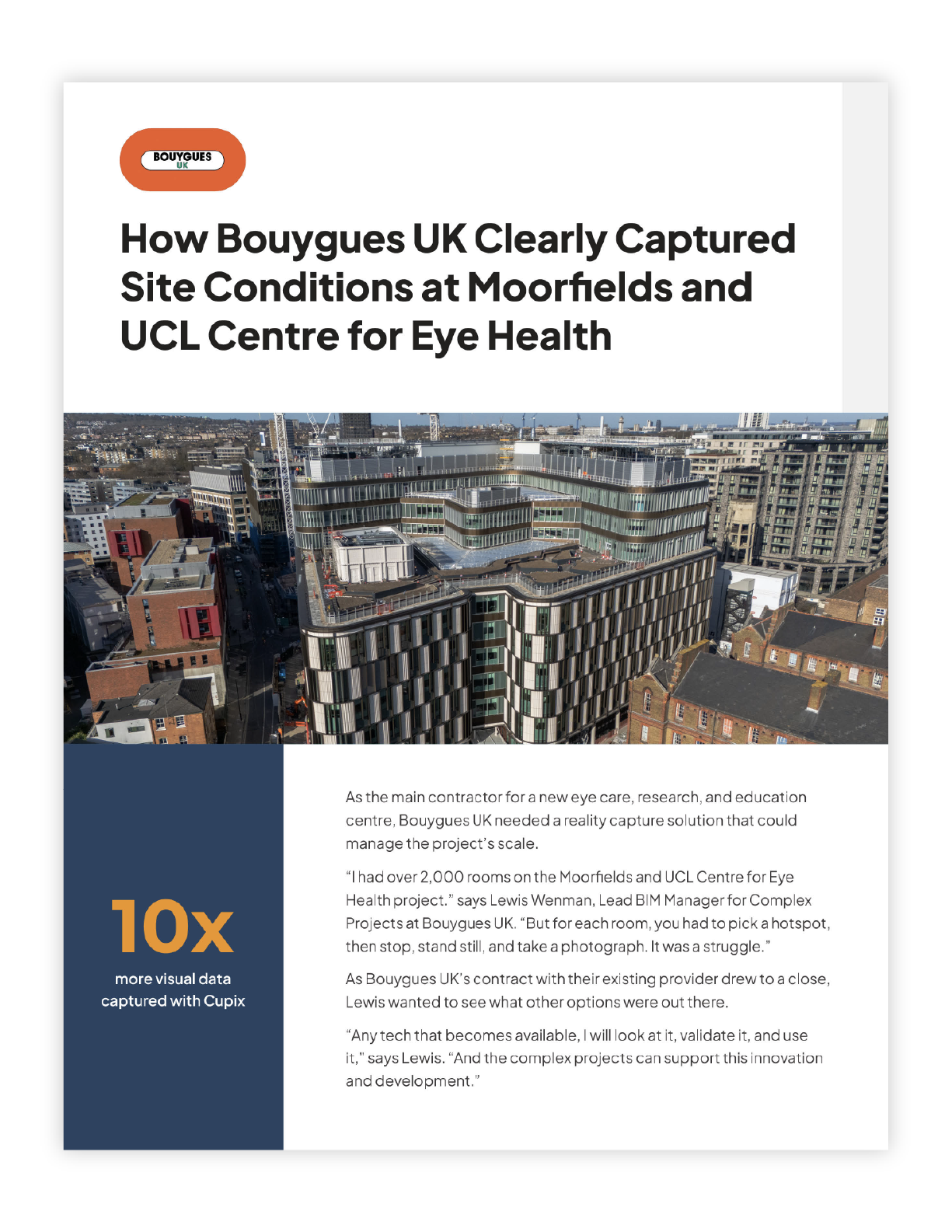 Since adopting Cupix for reality capture, Bouygues UK has been able to work more efficientlyon its complex projects like Moorfields and UCL Centre for Eye Health. Using Cupix, Bouygues UK was able to capture roughly 10 times the amount of visual data than they could have in the past, along with streamlining their preconstruction handover, and drone workflows.